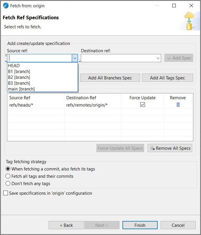 - In the Fetch from: origin window, select the source branch from the Source ref: drop-down in the Add create/update specification section, then click Finish.
