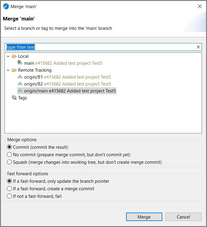 - In the Project Explorer, right-click on a project and select Team > Merge. After fetching, all the changes or commits of the source branch which are not merged are displayed in the fetch list.