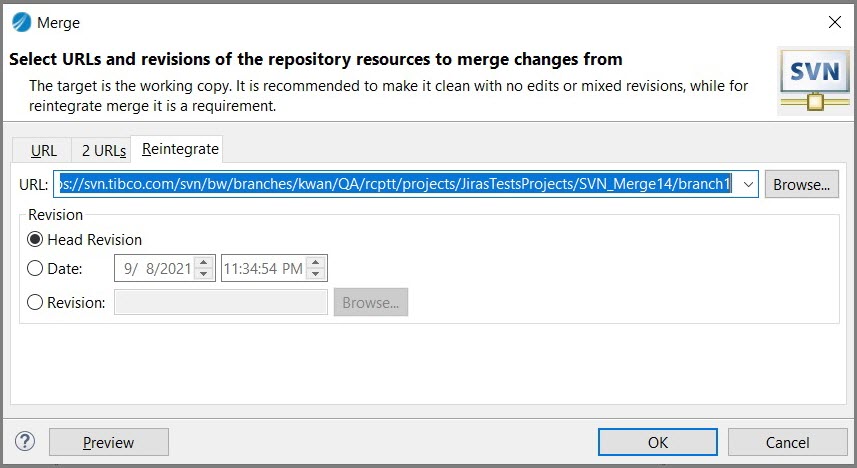 On the Merge window select one of the merge modes, URL merge or Reintegrate merge.