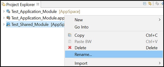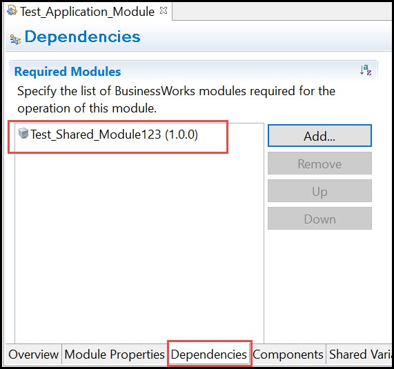 If any application module has dependency on the shared module, the new name of the shared module is also reflected in the Dependencies section of the application module.
