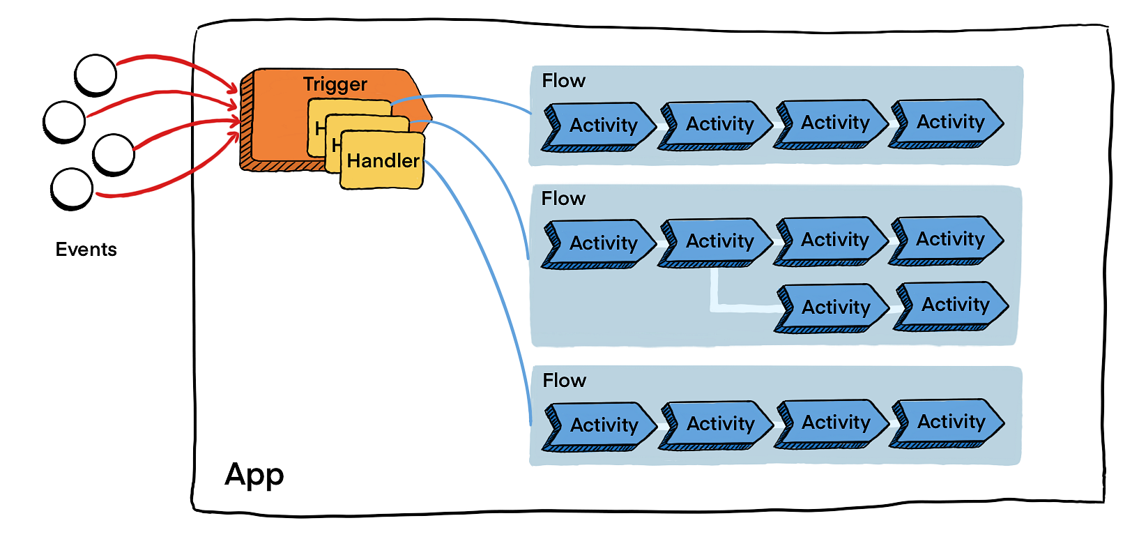 The trigger consists of one or more handlers that serve as the means of communication between the trigger and the flow. When the trigger receives an event, it uses the respective flow handlers to pass the data from the event to the flow in the form of flow input. The business logic in the flow then can use the event data coming in through the flow input. When the trigger expects a reply from the flow, the data from the flow is passed on to the trigger in the form of flow output. A flow can contain one or more conditional branches.